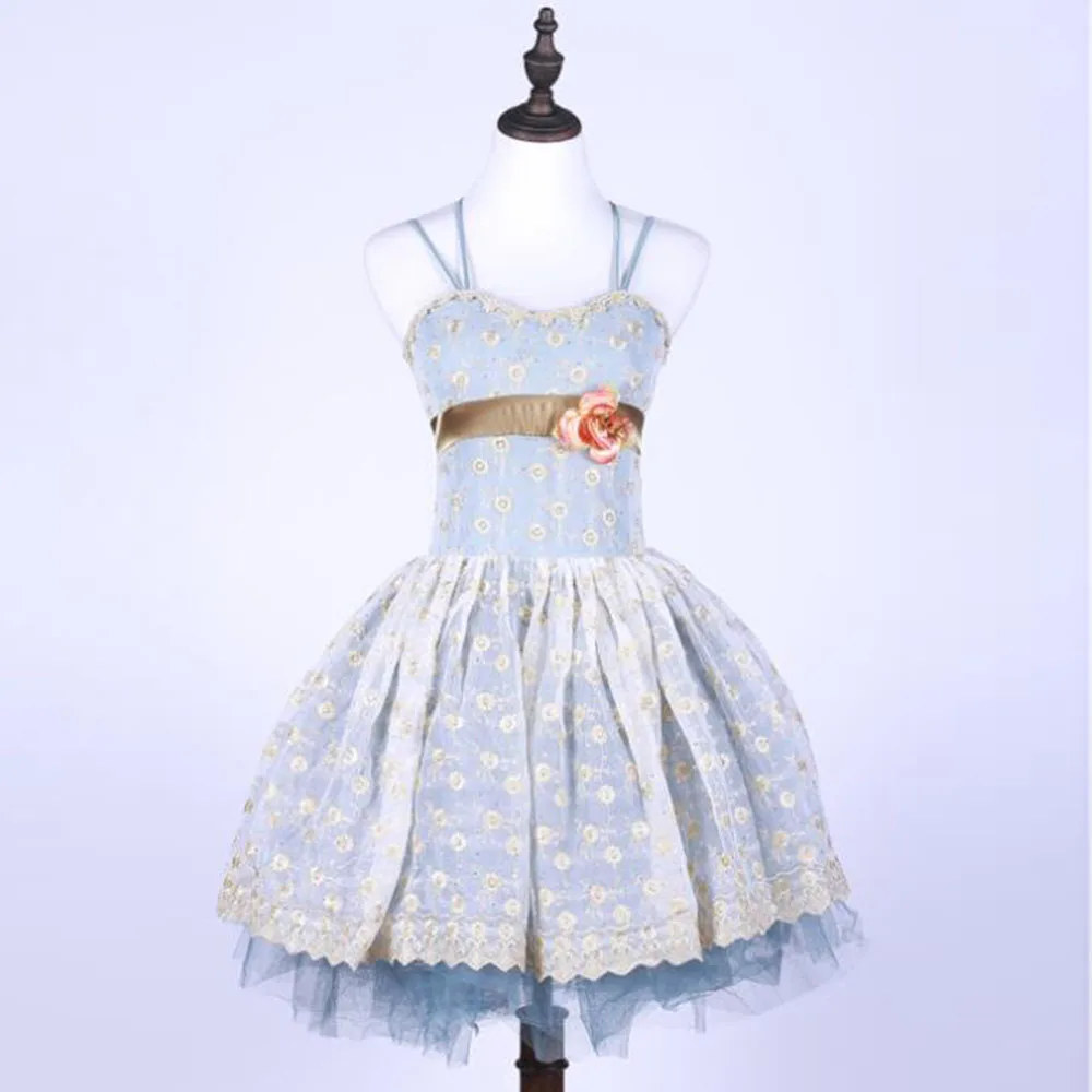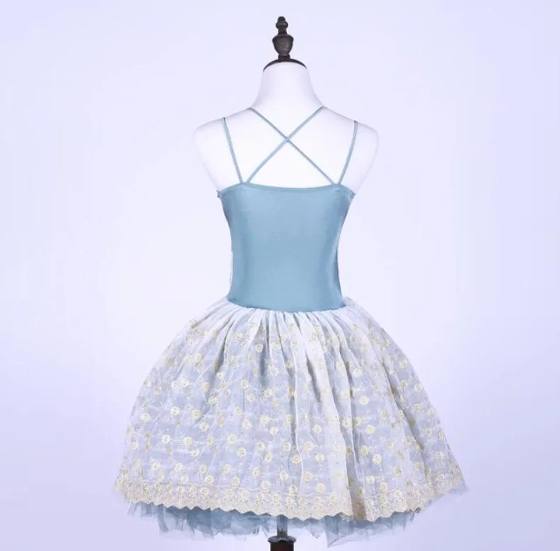 Ladies And Girls Lace Ballet Dance Costume, Blue Lace Strap Embroidered Mesh Ballet Skirt For Women